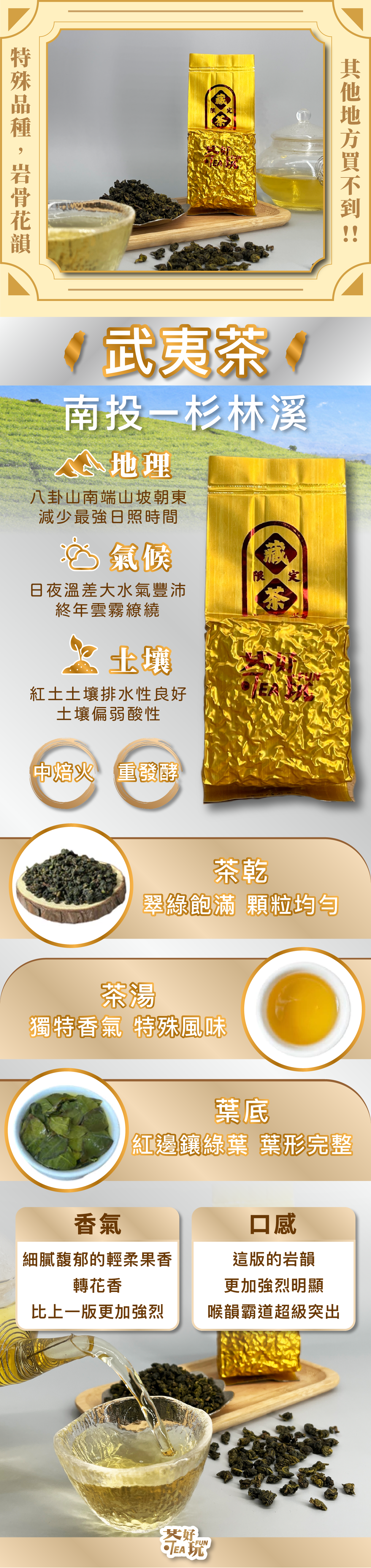 帶有岩韻的礦質感與明顯花香,口感厚、尾韻沉,輕焙火處理讓香氣更有層次。