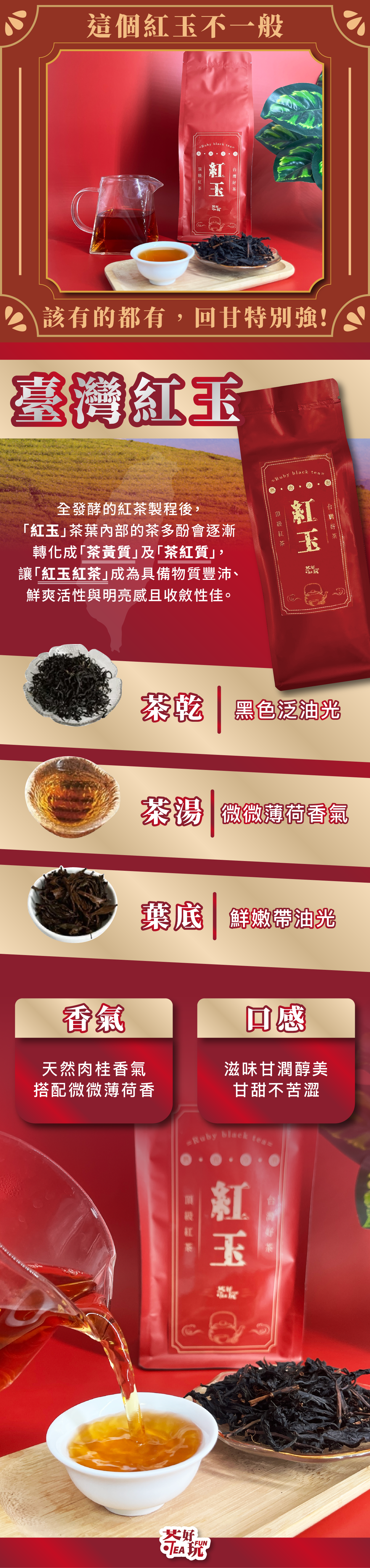 紅玉紅茶由台灣原生山茶與緬甸大葉種紅茶配種而成,條索粗壯、色澤墨黑帶紫光,沖泡後湯色金紅澄亮,香氣集中、尾韻悠長。
